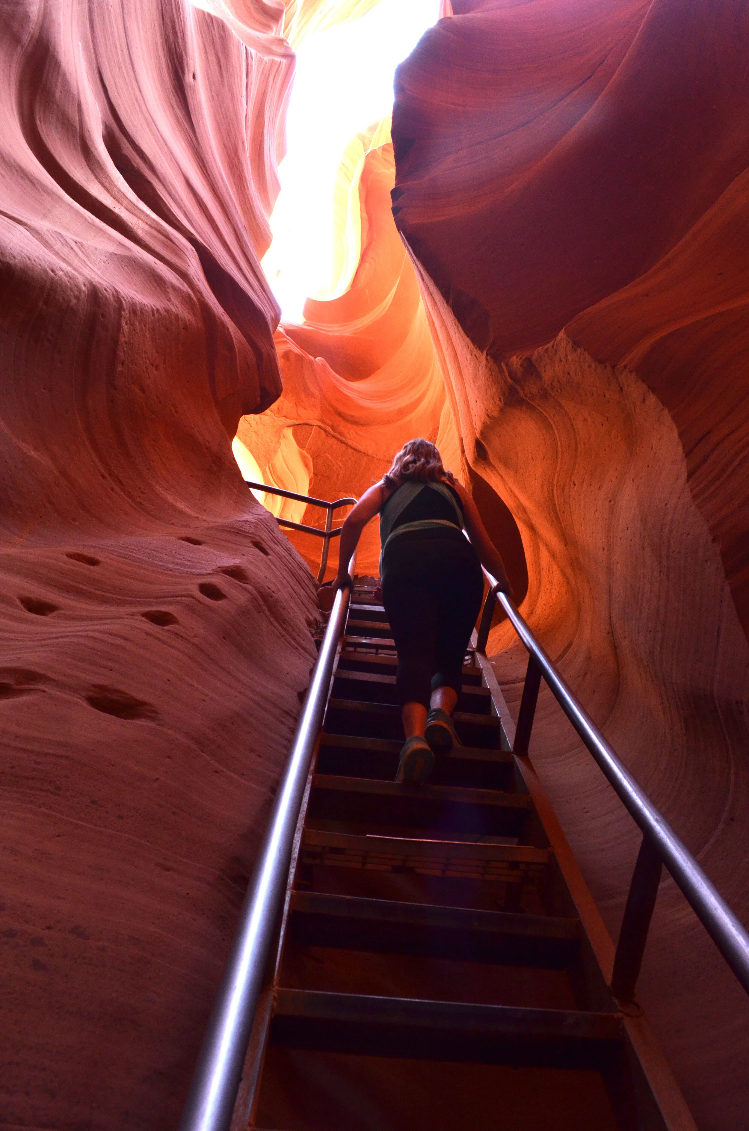 Lower Antelope Canyon is 95 feet below ground in some areas. Getting down into the slot canyon requires five sets of step ladders. There are handrails on most of them, so we wrapped Brody up in the Solly Wrap to free up our hands and descended down.