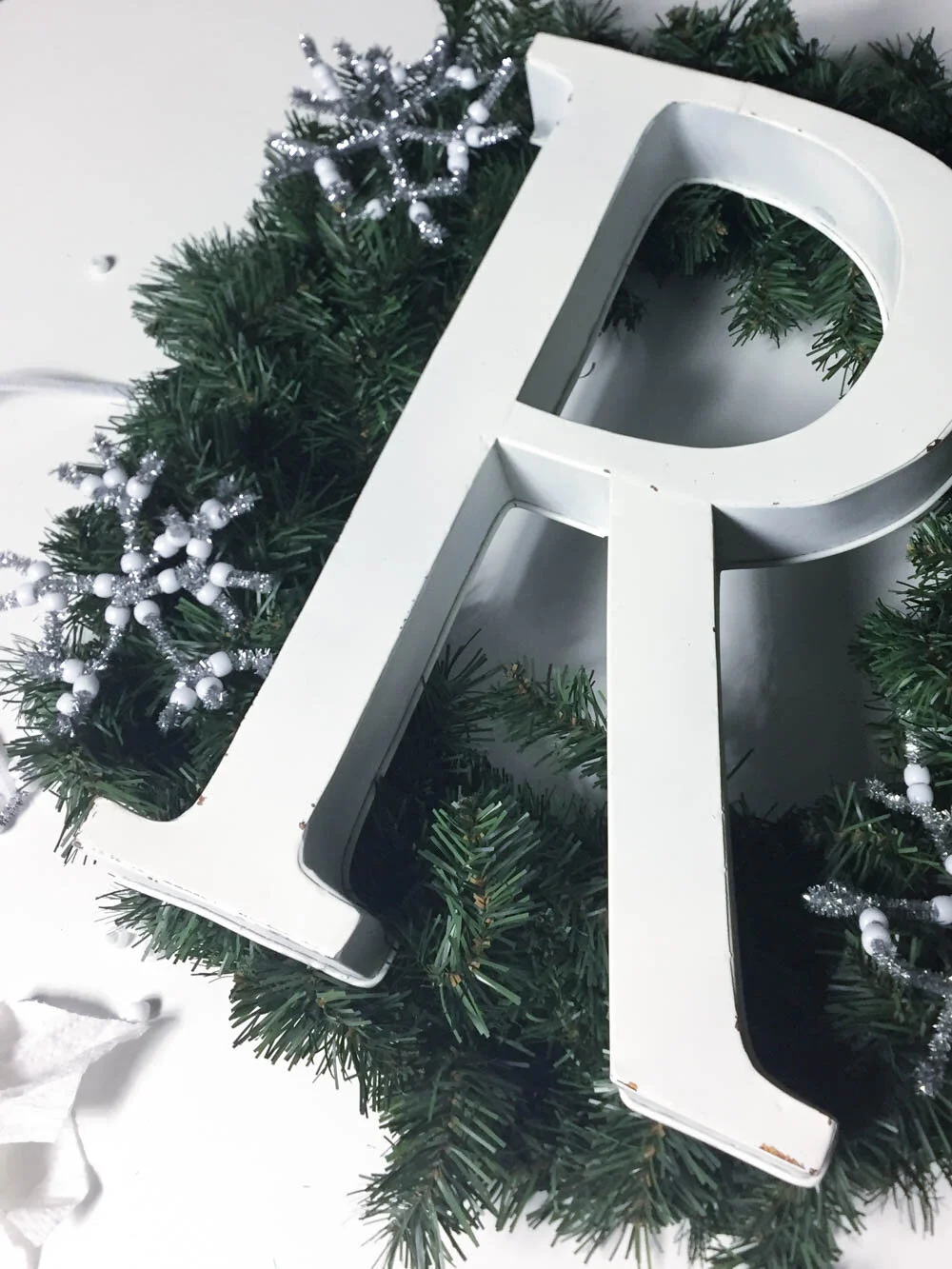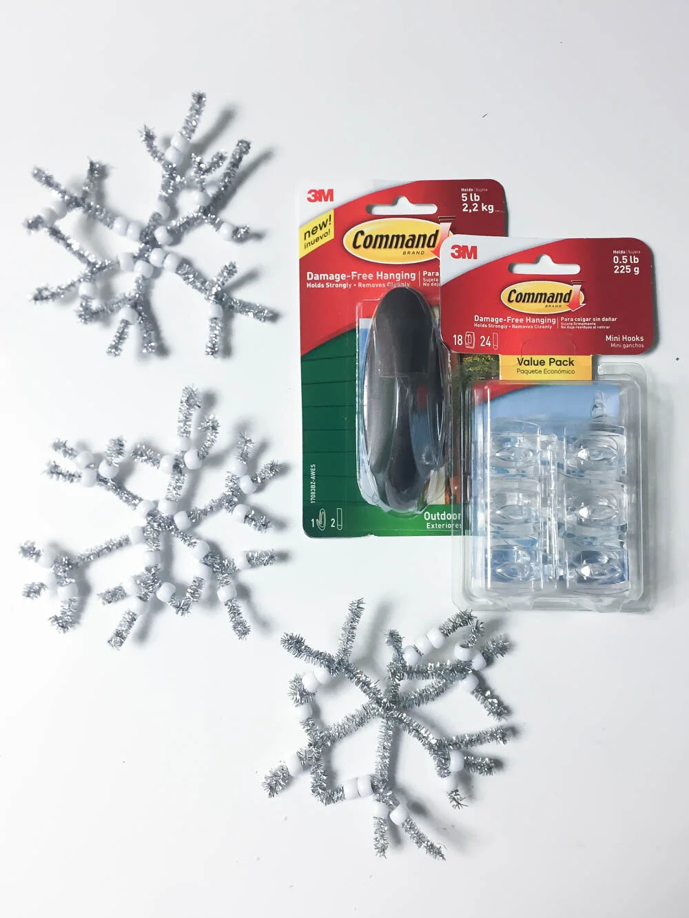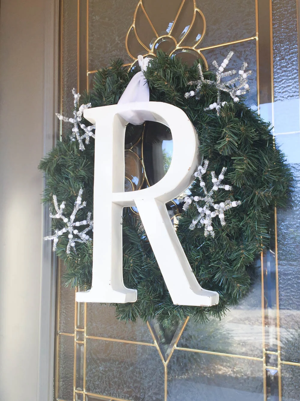 We made 4 snowflakes. They would make a fun ornament for a tree, but since we haven't gotten a tree yet, we decided to decorate a wreath for our front door with them! With a little piece of extra pipe cleaner, we secured the snowflakes to the wreath. We also added a big metal letter to the middle of the wreath with ribbon.