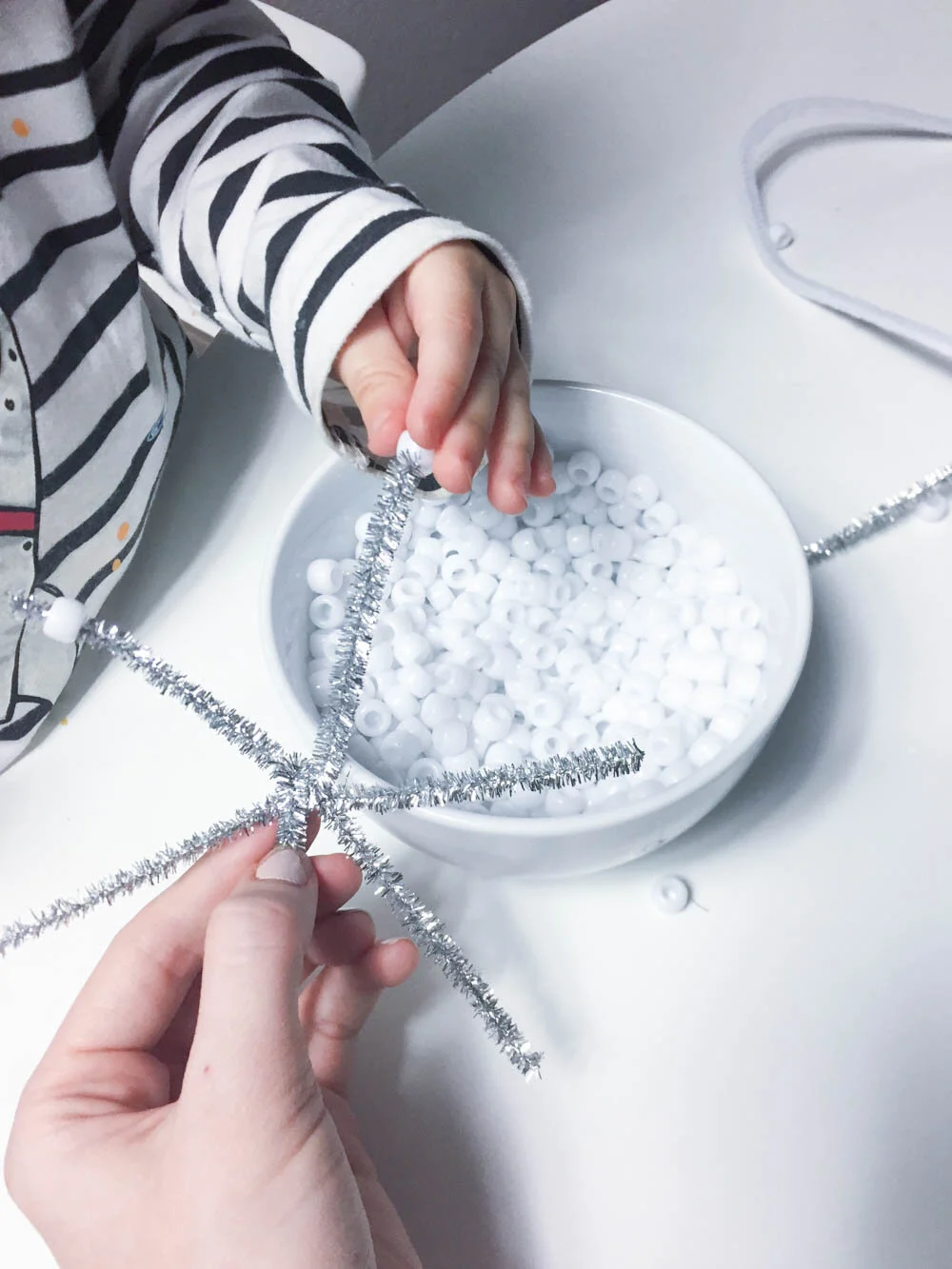 Let your little one add a few bead onto each of the arms of the snowflake.