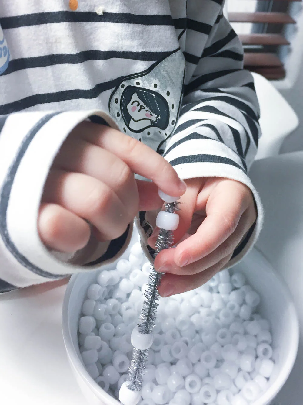 We pulled out a package of white pony beads and a handful of shiny silver pipe cleaners and got to work making snowflakes. Making the snowflake shape is a mom (or older kid) job, however decorating the snowflake with beads is the perfect toddler activity.