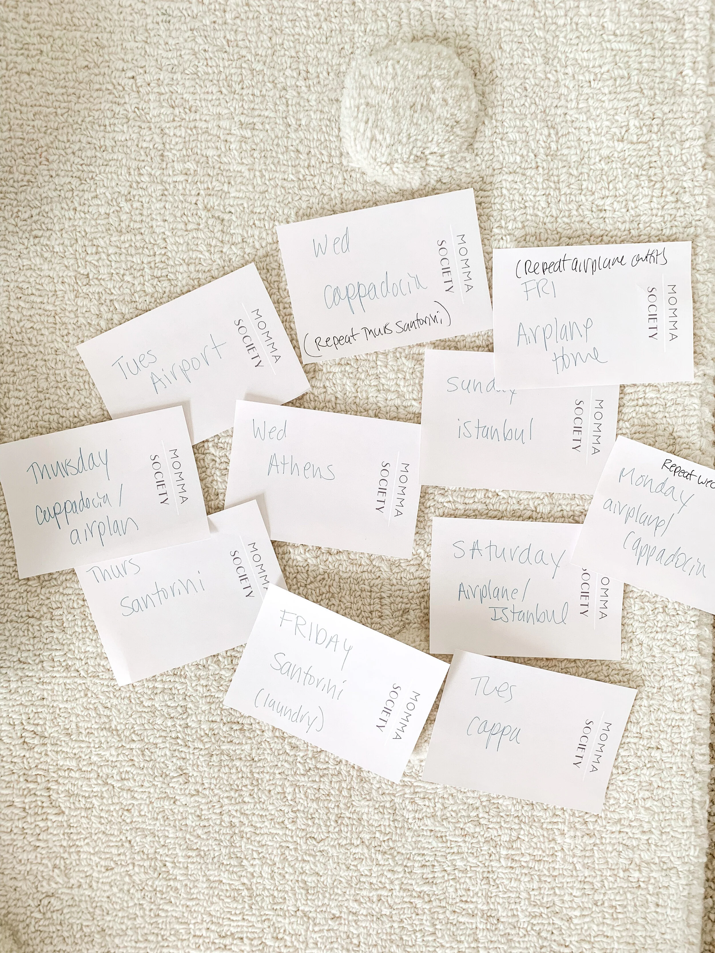 Step 1 Make a sticky note for each day we are traveling that says the date, where we will be, and any plans we have that day that may affect what we wear (ie: beach, hiking etc). Also indicate the day(s) you have the ability to do laundry.
