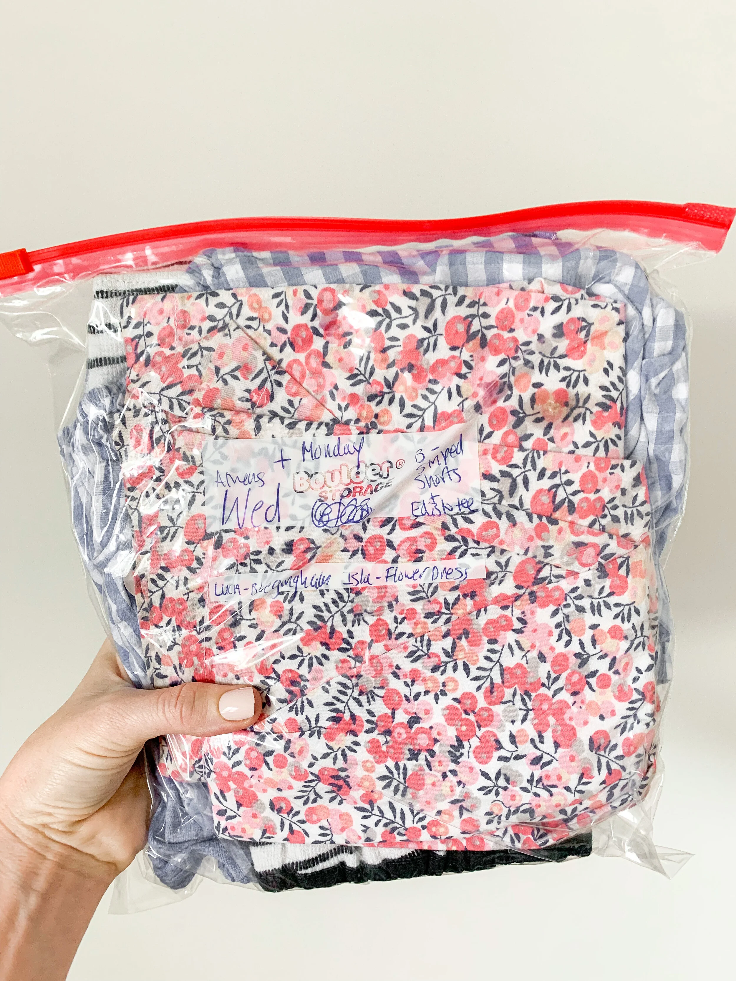 Step 5 Use gallon sized slider closure bags and place all of the kids outfits needed for that day in one bag. Squeeze as much air as possible out. Repeat.