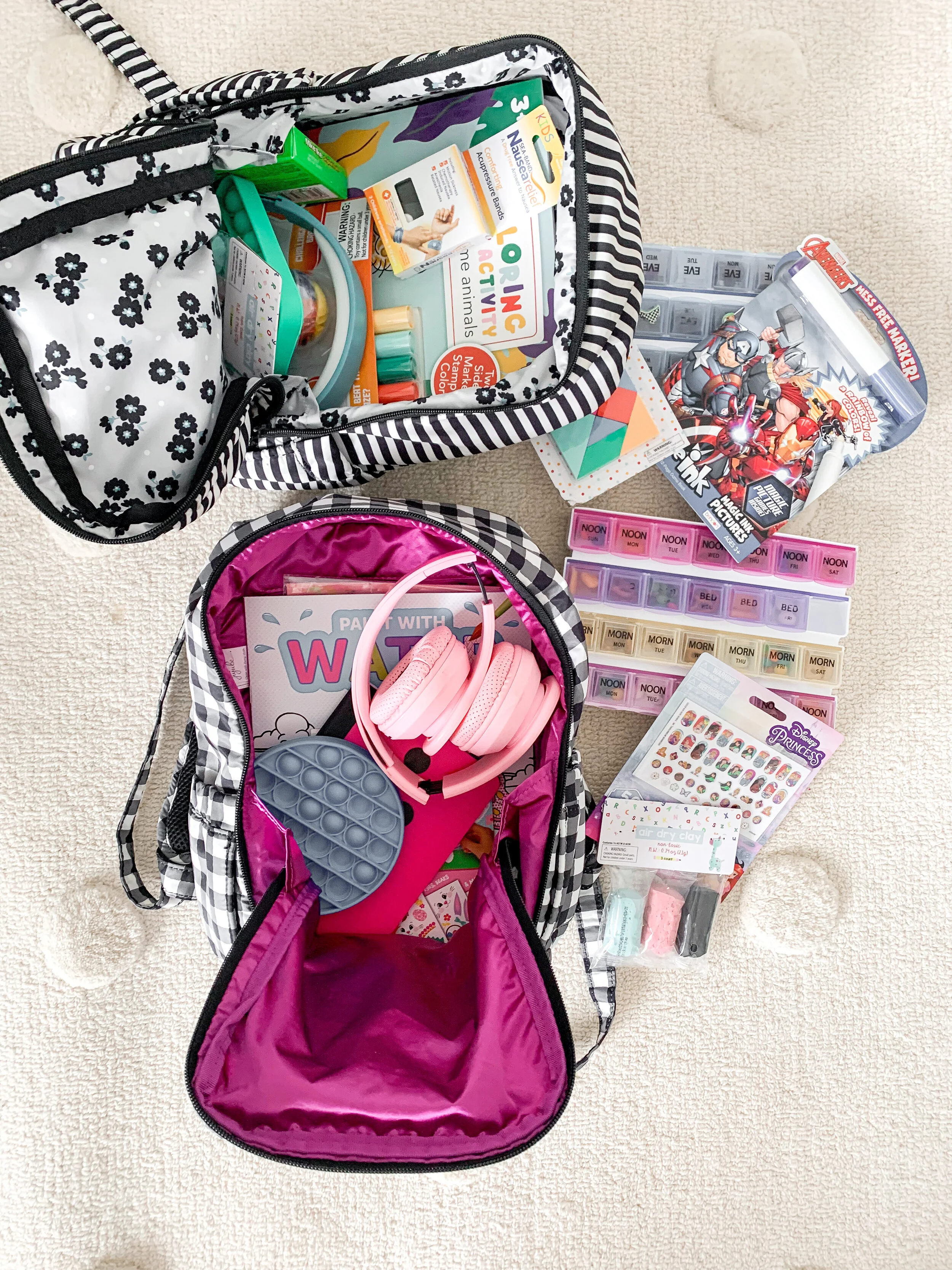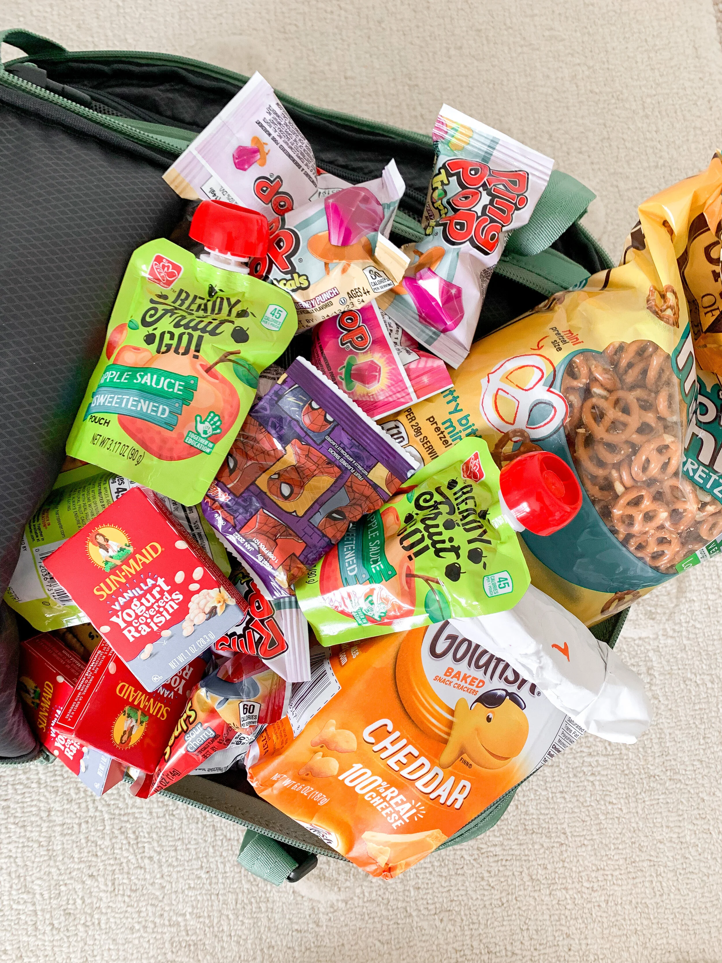 Snacks galore: I make each kid a snack pack like these on IG. I bring lots of lollipops for bribes + to use on take-off and landing to help their ears pop.