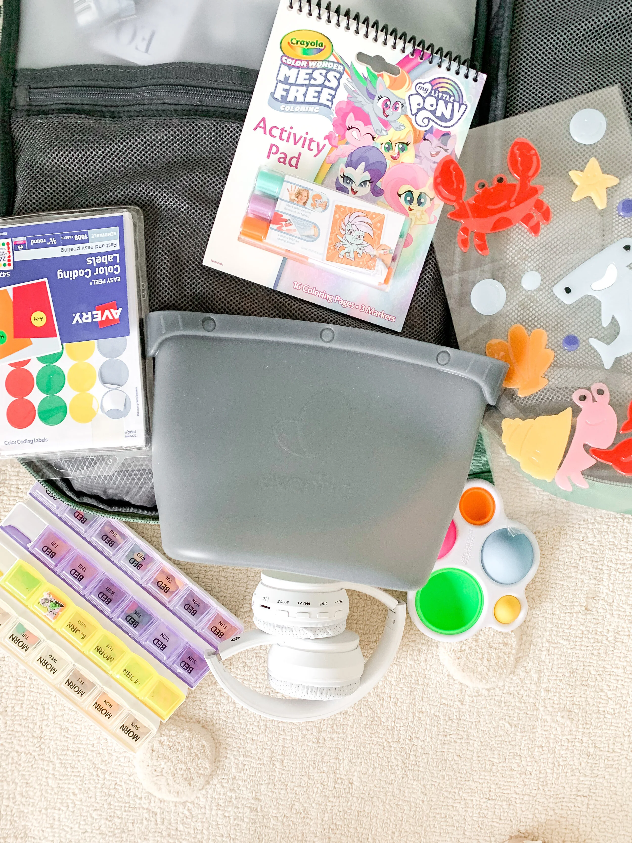 Activities: Window gel clings, fidget poppers, things from the Target dollar spot, activity book, dot stickers and activities from Magic Playbook are my go-tos.