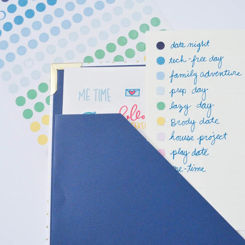 I am using a Color Coding Sticker Set to keep track of our non-negotiables each month. I keep a little guide in the front pocket of my Simplified Planner and on my monthly planning day, I go through and make sure that everything on my non-negotiables list is scheduled in for the month. You are probably wondering what my non-negotiables are. These are my 9.
